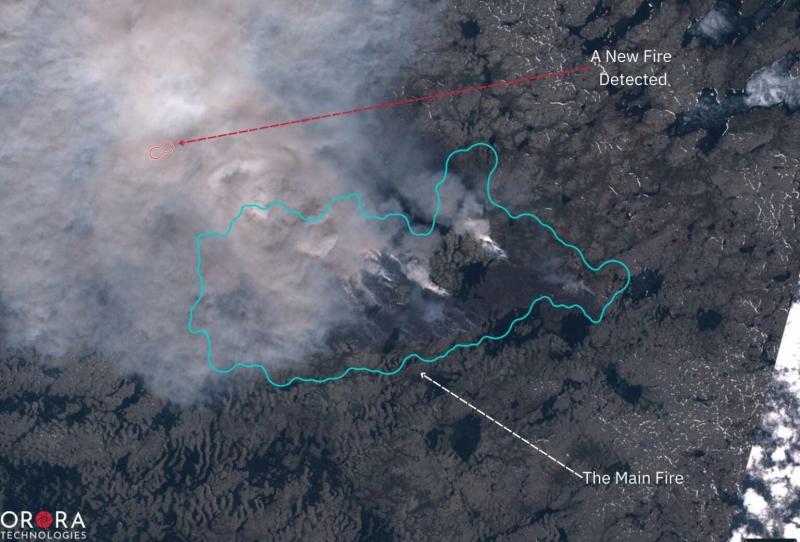 Another use of OroraTech’s solution that has been especially helpful is for detecting newly born fires that started as a result of a bigger fire spreading, burning the material around its vicinity. As it usually happens in these cases, the wind swirls the smoke in different directions and limits the visibility of the fire from the sky, meaning that planes, drones, and other traditional methods of wildfire monitoring remain quite helpless and blind to detect those newly born fires.